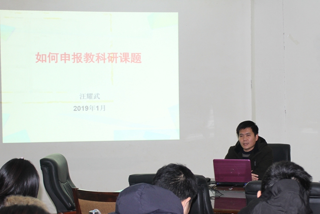 接着,汪耀武副教授就青年教师科研工作开展难度大的普遍问题,结合多年来的课题研究经验,做了“如何申报教科研课题”的培训讲座。从“为什么要做教科研”、“如何做教科研”等方面向教师介绍了教研科研项目申报的相关知识,分享了自己的心得体会,传授了课题申报技巧,并且建议大家“依托专业搞研究、依托课题写论文”。