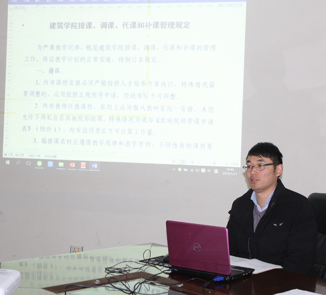 为进一步规范教学行为,提高教师的教学能力与科研水平,2019年1月11日下午,建筑学院在建筑楼207会议室举办了教师教学科研培训会。会议由建筑学院教学负责人汪耀武副教授主持,全体任课教师参加了培训会。
