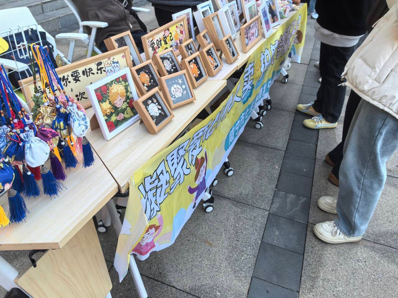 广场左侧,两张长桌拼成的义卖区前人头攒动。钻石画《星空》、艾草香包、手工串珠、蒲扇彩绘等120余件作品全部出自“七彩梦”学员之手。建筑学院志愿者一对一担任“小店长”,耐心讲解制作故事。短短一个半小时,手作区销售额达600元,为活动贡献了主力善款。